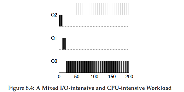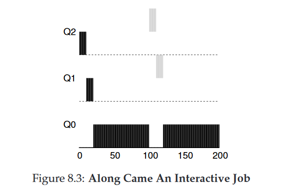 → CPU 위주 작업들처럼 A(검은색)는 가장 낮은 우선순위 큐에서 실행되고 있다. B(회색)는 T=100에 시스템에 도착하고 가장 높은 우선순위 큐에 놓여진다. 실행 시간이 짧기 때문에 (단지 2ms), 두 번의 time slice를 소모하면 B는 바닥의 큐에 도착하기 전에 종료한다. A는 낮은 우선 순위에서 실행을 재개한다.