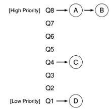 작업은 최고 우선 순위로 진입한다.→ Q2, 10msec timeslice가 하나 지나면 Schduler는 작업의 우선 순위를 한 단계 낮추어 해당 작업을 Q1으로 이동시킨다. 다시 하나의 Time Slice 동안 Q1에서 실행한 후 작업은 마침내 가장 낮은 우선순위를 가지게 되고 Q0으로 이동된다. 이후엔 Q0에 계속 머무른다.