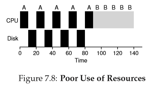 Example: A와 B가 있다고 하자. 각 작업은 50msec의 CPU 시간을 필요로 한다. A는 10mesc동안 실행한 후 I/O 요청을 한다.(I/O 시간은 10msec라고 가정한다.) B는 I/O 작업이 없다.