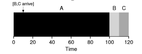 Example: Assume Arrives at t = 0 and needs to run for 100 seconds, whereas B and C arrive at t =10 and each needs to run for 10seconds. What is the average turn-around time?