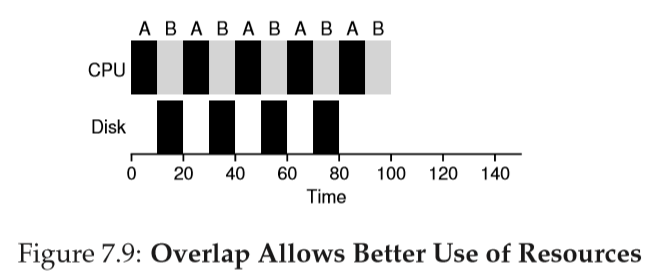 일반적인 접근 방식은 A는 각 10msec 하위 작업을 독립적인 작업으로 다루는 것이다. 시스템이 시작할 때 10msec 작업들과 50msec를 스케줄하는 것이다. STCF의 경우 가장 짧은 작업을 선택한다. A다. A를 실행하고 B를 선점하여 10msec동안 실행한다. 입출력이 끝나기를 기다리는 동안 CPU는 다른 프로세스에 의해 사용되어 연산의 중첩이 가능해진다.