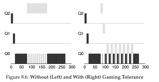 EX) Workload가 Scheduler를 자신에게 동작시키려고 할 때 예전 규칙 4a, 4b일 때 행동(왼쪽), 새로운 규칙 4(오른쪽)을 아래 그림을 통해 아 수 있다. 이런 자신에게 유리하도록 조작하는데 대한 방지책이 없다면 프로세스는 time slice가 끝나기 직전에 입출력 명령어를 내릴 수 있어 CPU 시간을 독점할 수 있다. 방지책이 마련되면 프로세스의 입출력 행동과 무관하게 아래 단계 큐로 천천히 이동하게 되어 CPU를 자기 몫 이상으로 사용할 수 없게 된다.