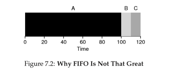 Example: Let's again assume three jobs but this time A runs for 100 seconds while B and C run for 10 seconds. ← workload의 1번 Assumption을 완화시켰다. FIFO에서 성능이 구리다...!!!!