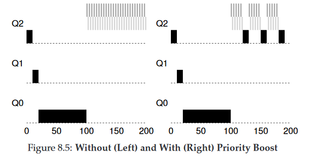 규칙을 보완하여 Starvation 문제를 방지할 수있는지 살펴보자. 간단한 아이디어는 주기적으로 모든 작업의 Priority를 boost(상향 조정)하는 것이다. 일단 간단한 방법: 모두 최상위 큐로 보내는 것이다.