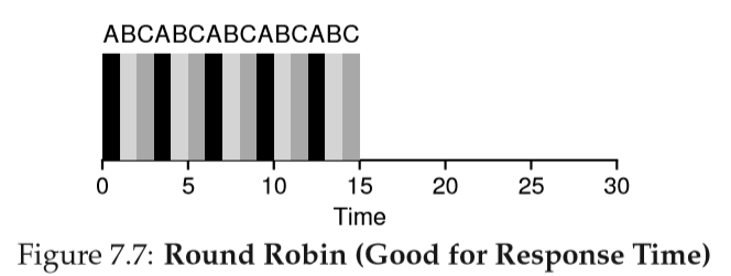 기본 발상: Instead of running jobs to completion, RR runs a job for a time slice(or scheduling quantum) and then switches to the next job in the run queue.