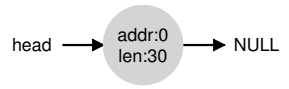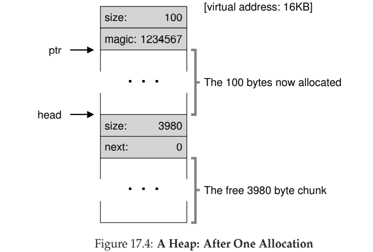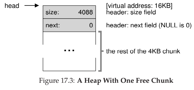 이 코드의 실행 후 리스트는 크기 4088의 항목 하나만을 가지게 된다. 매우 작은 힙이다. head 포인터는 이 영역의 시작 주소를 담고 있다. 영역의 시작 주소를 16KB라고 가정하자.
