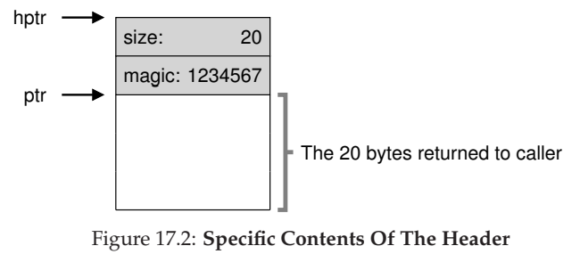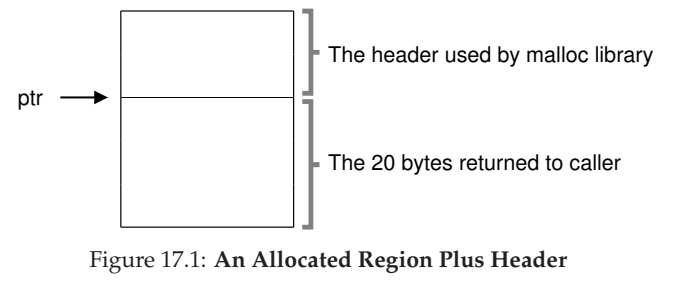 *우리는 포인터가 인자로 전달되면 malloc 라이브러리는 해제되는 메모리 영역의 크기를 신속하게 파악하여 그 공간을 빈 공간 리스트에 추가할 수 있다고 가정한다. 이 작업을 보통 allocator는 추가 정보를 header block에 저장한다. header block은 메모리에 유지되며 보통 해제된 chunk 바로 직전에 위치한다.