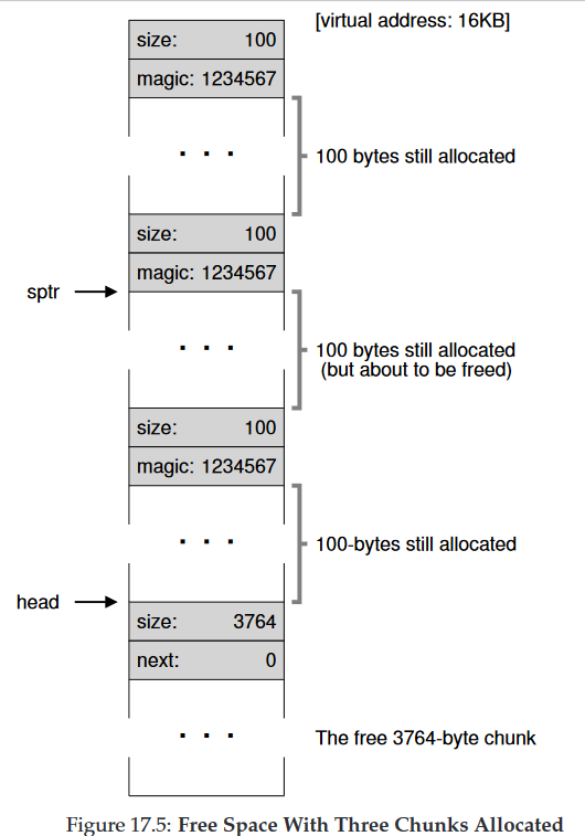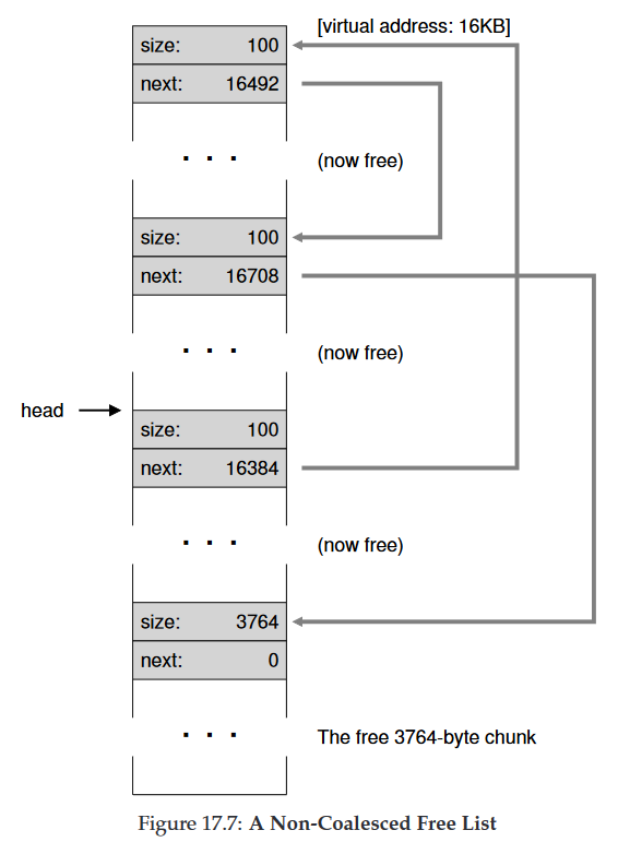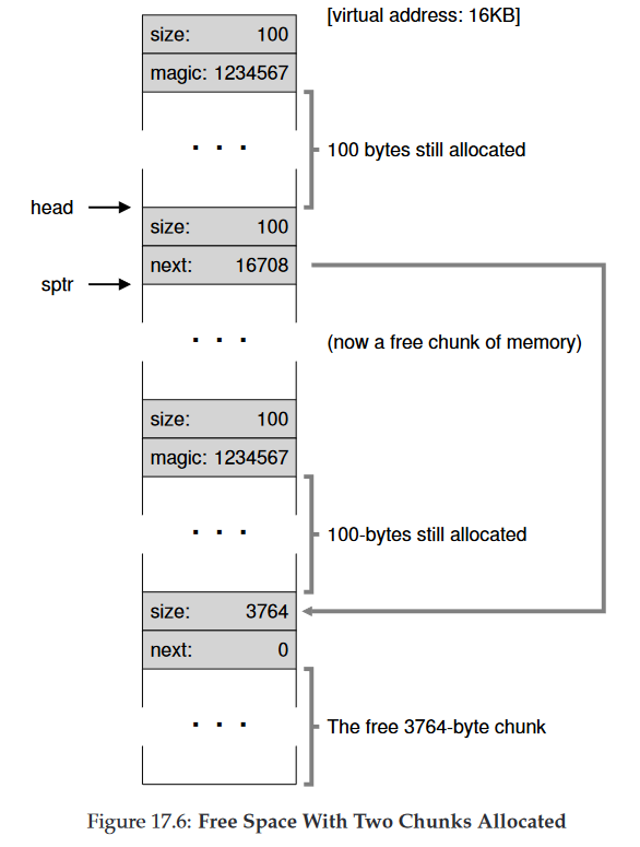 이제 빈 공간 리스트의 첫번째 원소는 작은 빈 청크(100바이트크기이며 list의 헤드가 가리킨다.) 두번째 원소는 큰 빈 청크 3764이다. 드디어 우리 리스트가 하나 이상의 원소를 가진다.