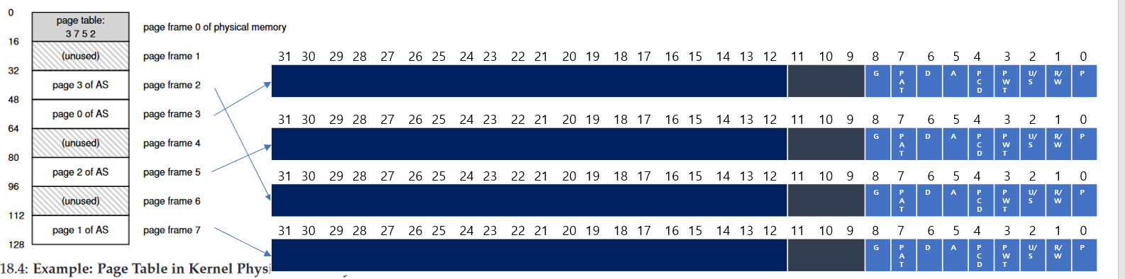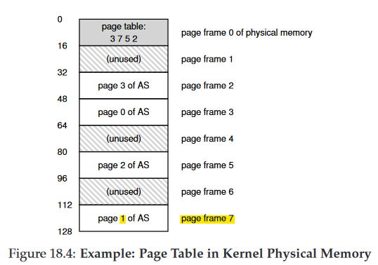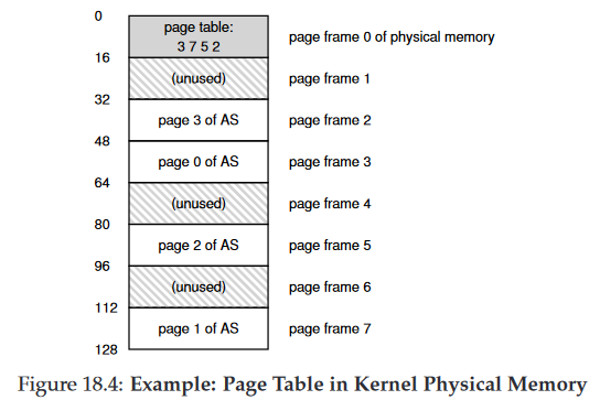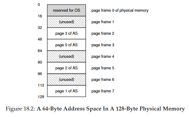 Physical Memory는 위와 같이 고정 크기의 슬롯들로 구성되고 위 경우 8개의 page frame, 총 128bite로 이루어진 비현실적인으로 작은 physical memory다. 가상 주소 공간의 page들은 physical memory 전체에 분산 배치 되어있다. (18.1 그림이 phsical memory에 배치되어있다고 생각해보자)