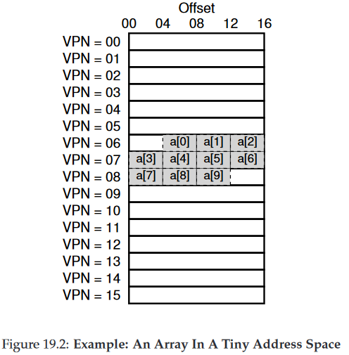위 코드는 총 10번의 translation이 발생한다. 하지만 이 때 a[0], a[3],a[7]에서는 TLB Miss가 발생하여 Page Table에서 변환해야하지만 나머지 7번의 접근, 즉 전체 Translation 중 70%에서는 TLB Hit가 발생하여 시간 절약이 가능하다. 이는 배열이 연속된 주소 공간에 있기 때문에 가능하다. 이를